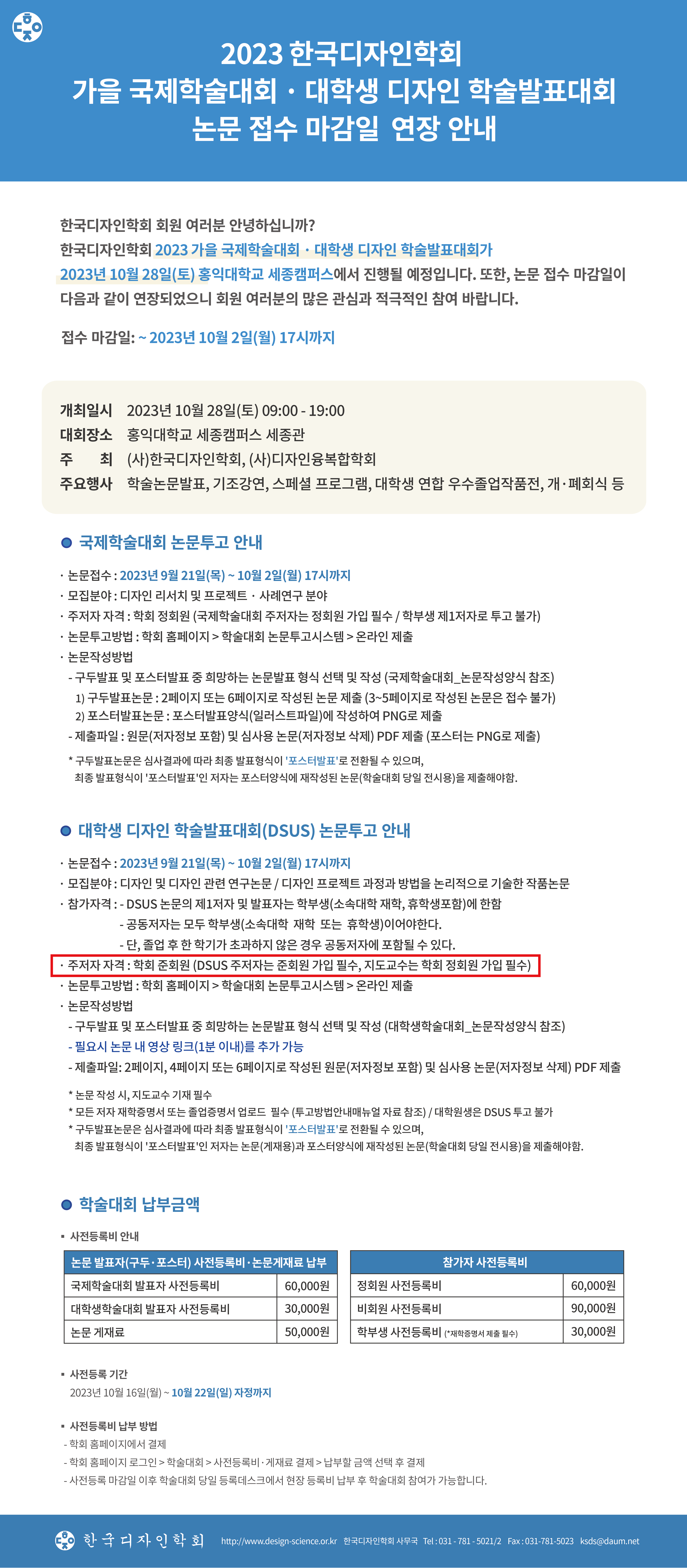 2023 한국디자인학회 가을 국제학술대회 · 대학생 디자인 학술발표대회 논문 접수 마감일 연장 안내(~10/2)