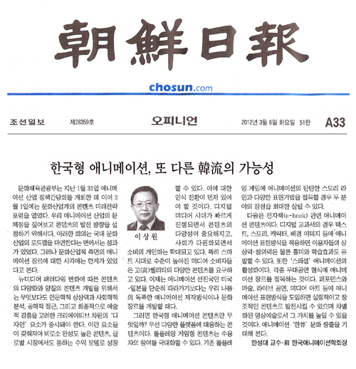 조선일보 칼럼_이상원(한국형 애니메이션 또다른 한류의 가능성)