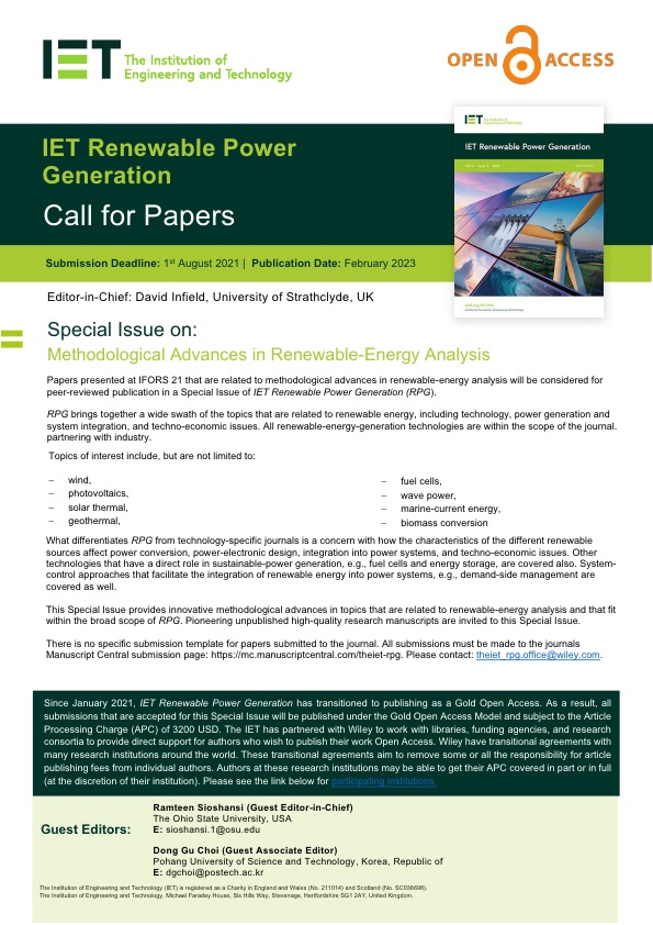 우리 학회에서 주최하는 금번 IFORS2021에 발표되는 논문들 중 일부를 IET PRG라는 SCI급 저널의 special issue에 게재하고자 아래와 call for papers 안내해드립니다.