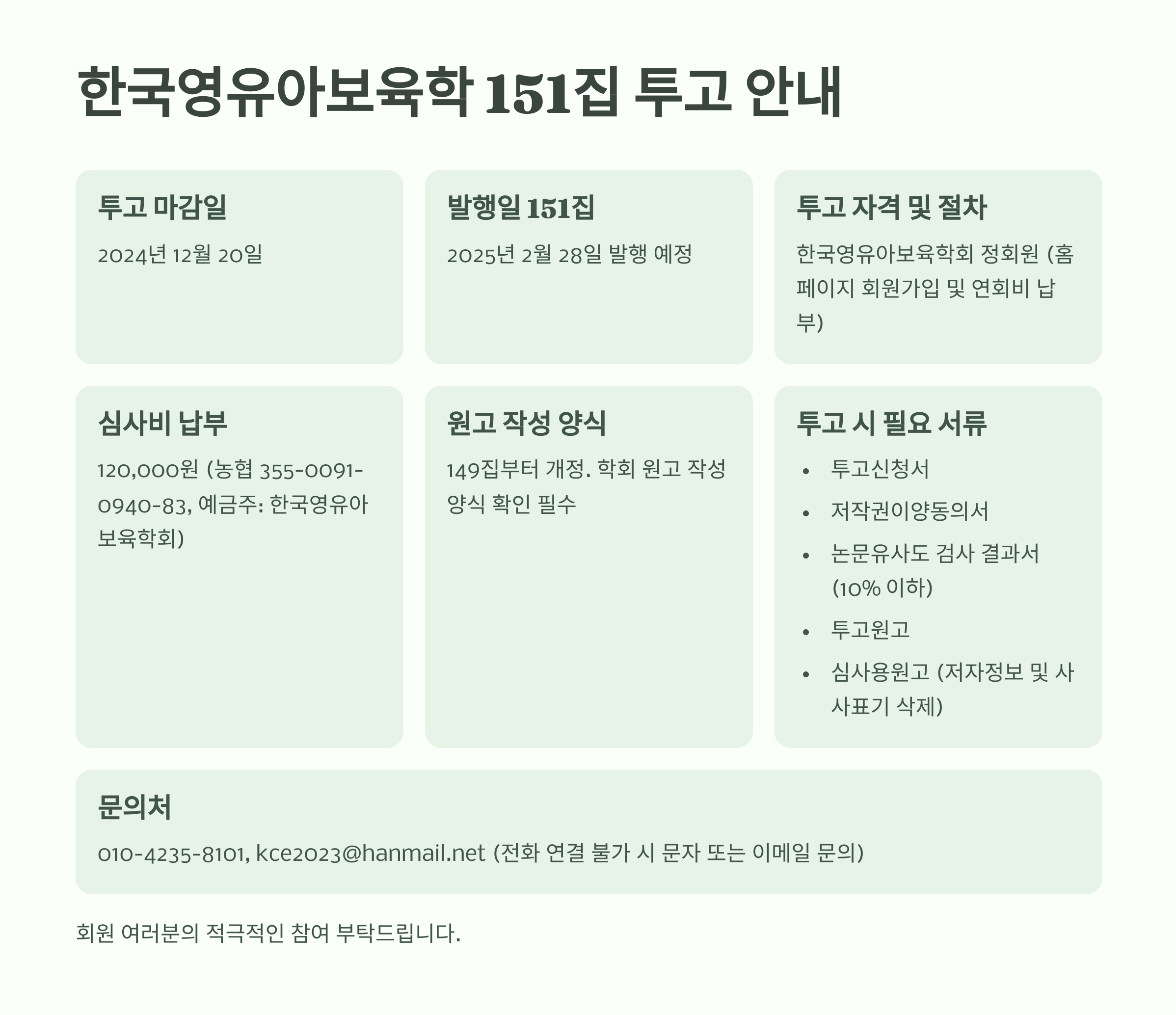 본 학회 발행 학술지 『한국영유아보육학』  151집  게재 원고를 아래와 같이 모집하고 있습니다.