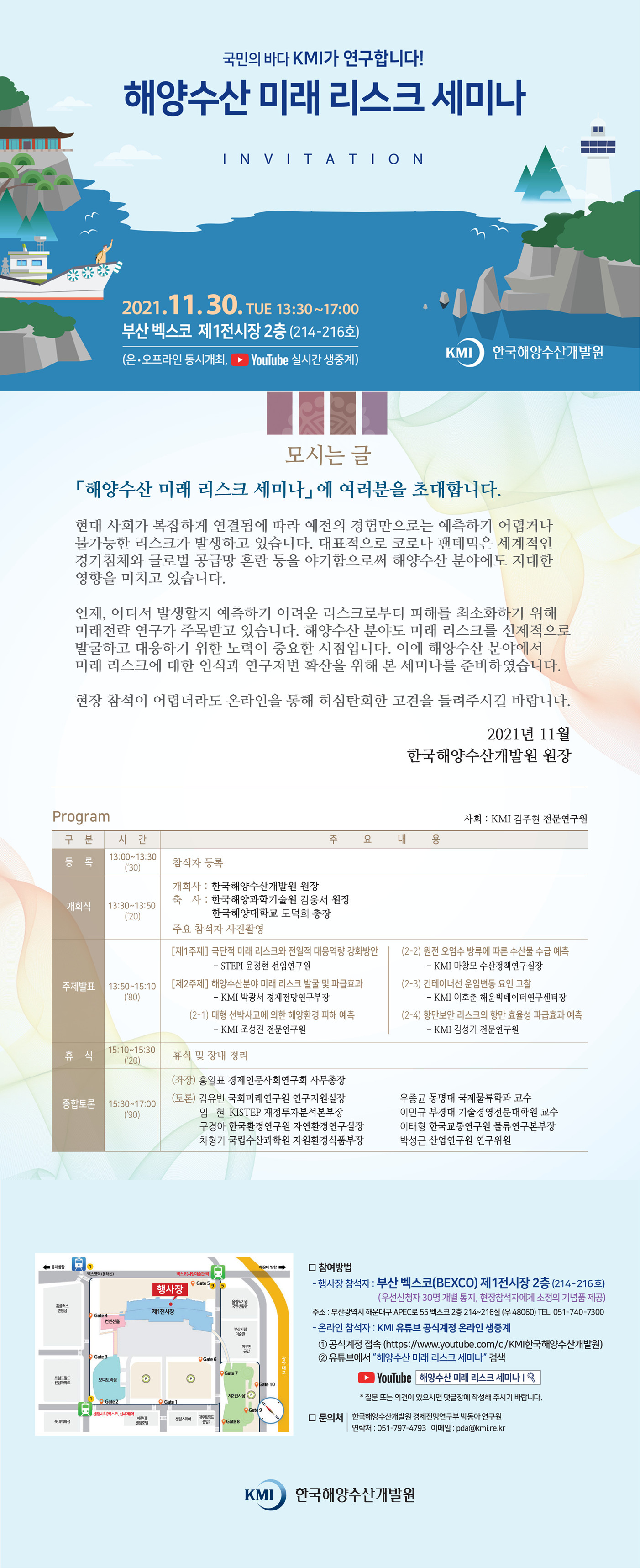 한국해양수산개발원(KMI)에서는 11 30일 해양수산분야 미래 리스크 연구 성과(미래 리스크 발굴 및 파급효과 분석) 발표 및 지식과 경험 공유를 통한 저변 확대의 장을 목적으로 '해양수산 미래 리스크 세미나'를 개최합니다