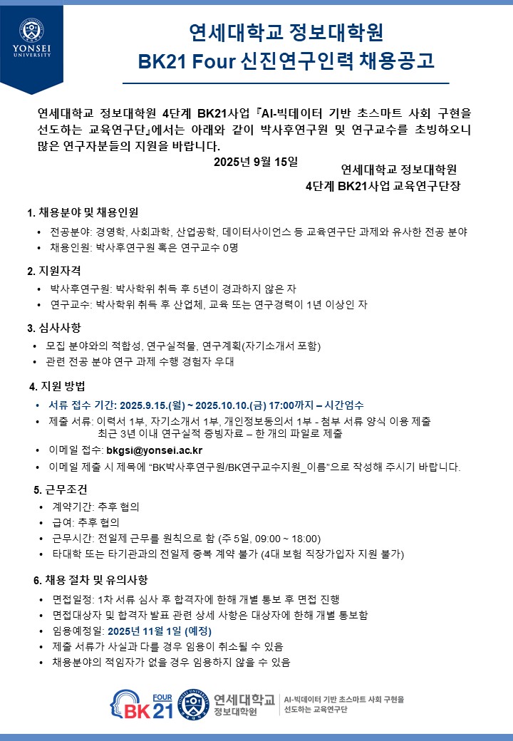 [초빙] 연세대 정보대학원 BK21 교육연구단 신진연구인력 채용공고