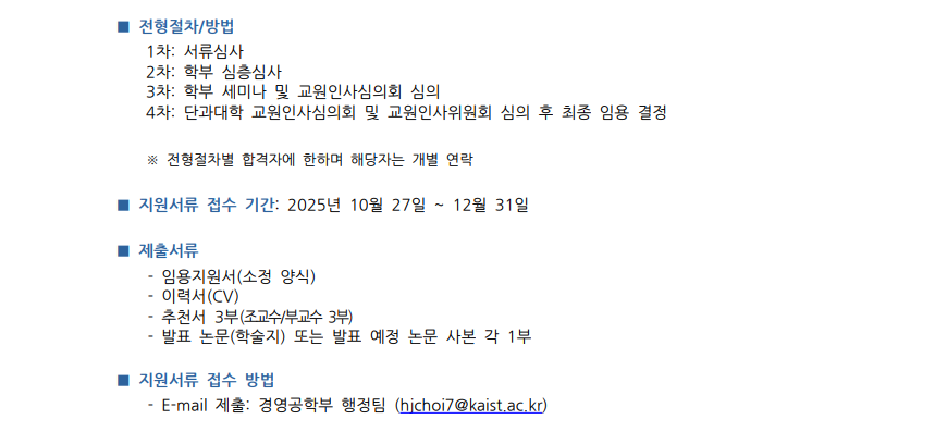 [초빙] KAIST 경영공학부 생산전략및경영과학 분야 전임교원 초빙 공고