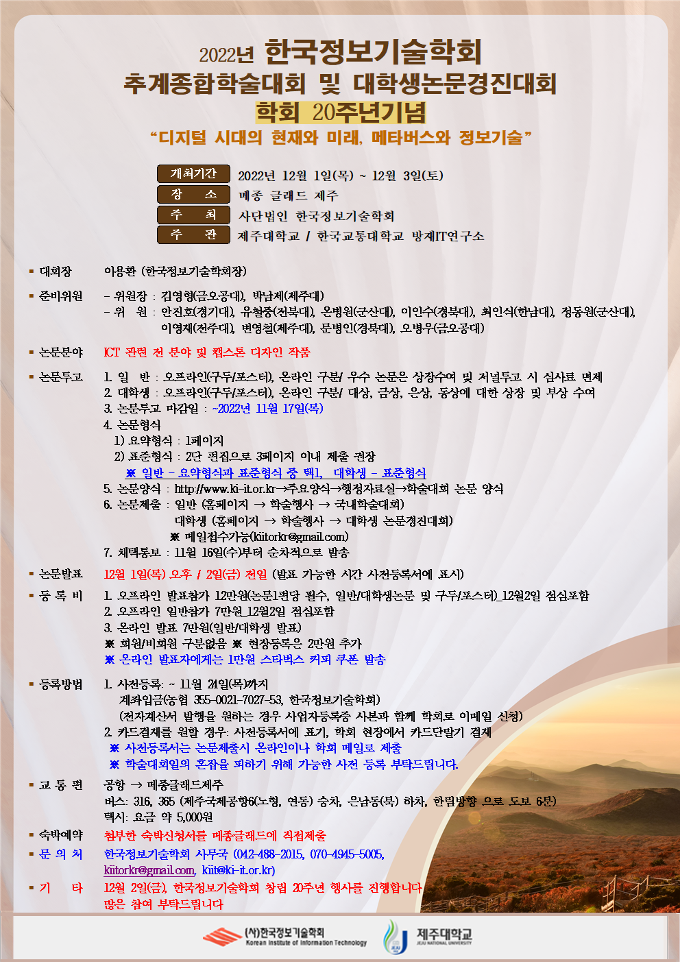 2022년 한국정보기술학회 추계종합학술대회 및 대학생논문경진대회 논문 투고 마감일(11월 17일 목요일) 이 연장되었습니다