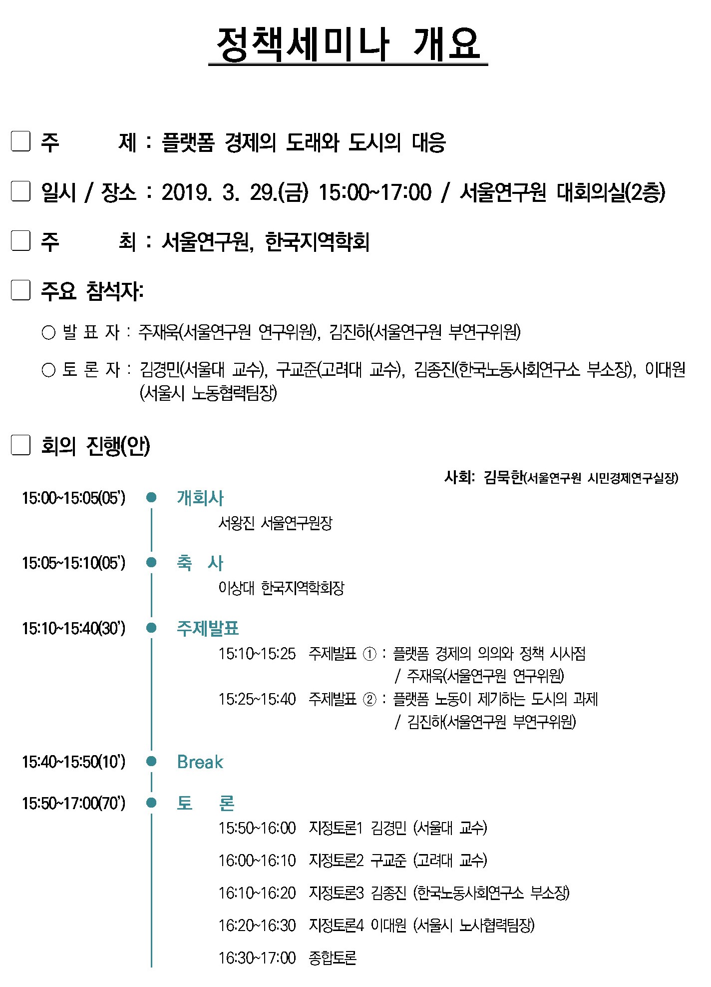 주 제 : 플랫폼 경제의 도래와 도시의 대응 일시 / 장소 : 2019. 3. 29.(금) 15:00~17:00 / 서울연구원 대회의실(2층) 주 최 : 서울연구원, 한국지역학회 주요 참석자: ○ 발 표 자 : 주재욱(서울연구원 연구위원), 김진하(서울연구원 부연구위원) ○ 토 론 자 : 김경민(서울대 교수), 구교준(고려대 교수), 김종진(한국노동사회연구소 부소장), 이대원(서울시 노동협력팀장) |