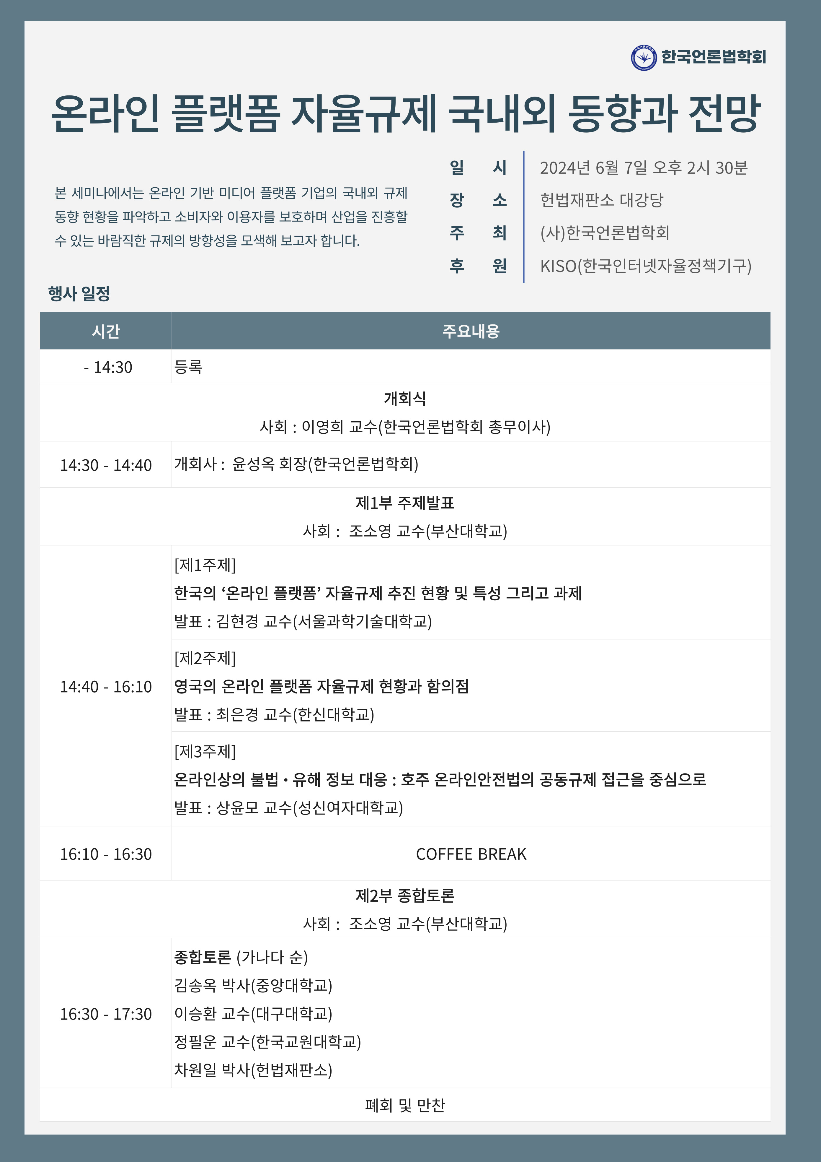 <온라인 플랫폼 자율규제 국내외 동향과 전망>을 주제로 한 학술세미나를 KISO(한국인터넷자율정책기구)의 후원으로 개최합니다.