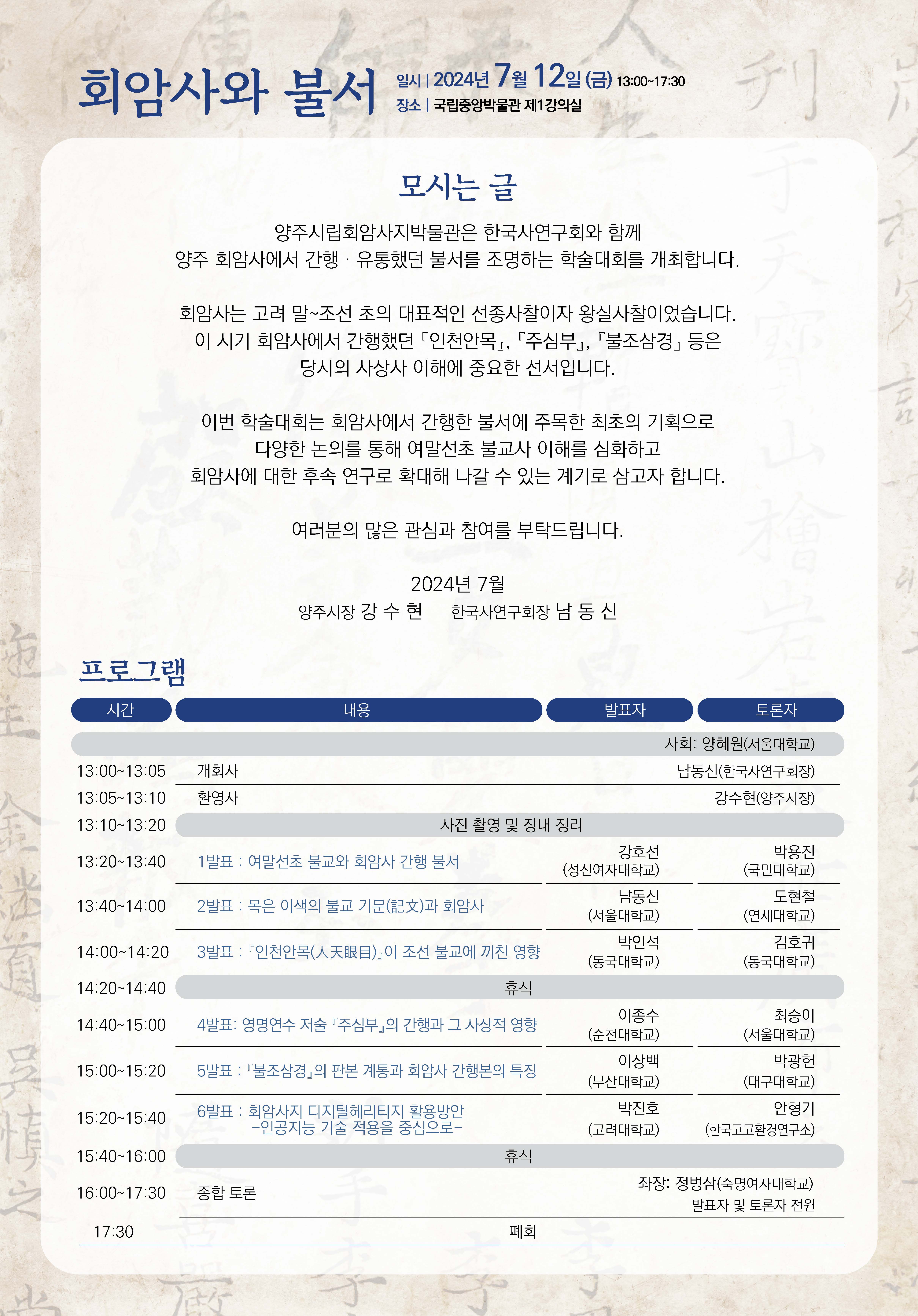 □ 주요내용 : 고려말~조선초 양주 회암사에서 간행한 불서를 조명하기 위한 발표 및 토론