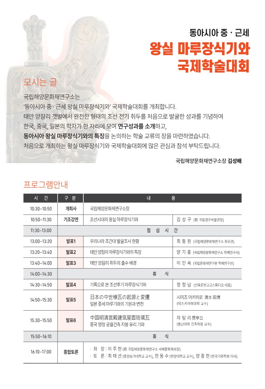 국립해양문화재연구소에서 2023년 5월 18일(목) [동아시아 중·근세 왕실 마루장식기와]을 주제로 국제학술대회를 개최합니다.
