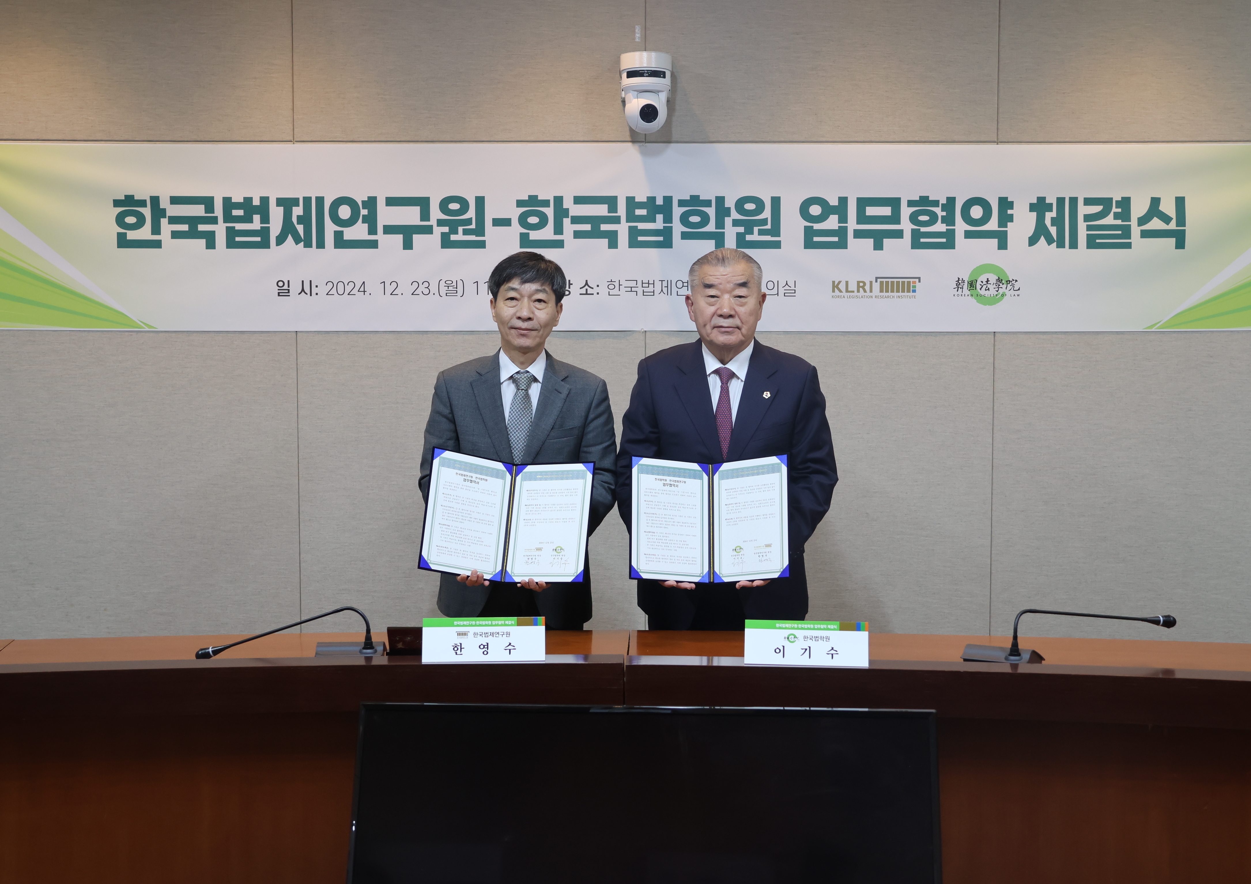 한국법학원(원장 이기수)과 한국법제연구원(원장 한영수)은 12월 23일 오전 한국법제연구원 중회의실에서 업무협약(MOU)을 체결했다. 이번 협약을 계기로 양 기관은 ▲법제 연구 활성화를 위한 공동연구 및 사업 협력 ▲정보교류를 위한 학술대회·포럼·세미나 등 공동개최 ▲학술자료, 출판물 등 지식·학술정보 분야에서 적극 협력을 약속했다. 이날 협약식에는 한국법학원 이기수 원장, 임성근 총무이사(법무법인 해광 대표변호사), 최병규 연구이사(건국대 법전원 교수)와 한국법제연구원 한영수 원장, 이순태 부원장, 김종천 기획경영본부장 등이 참석하였다.