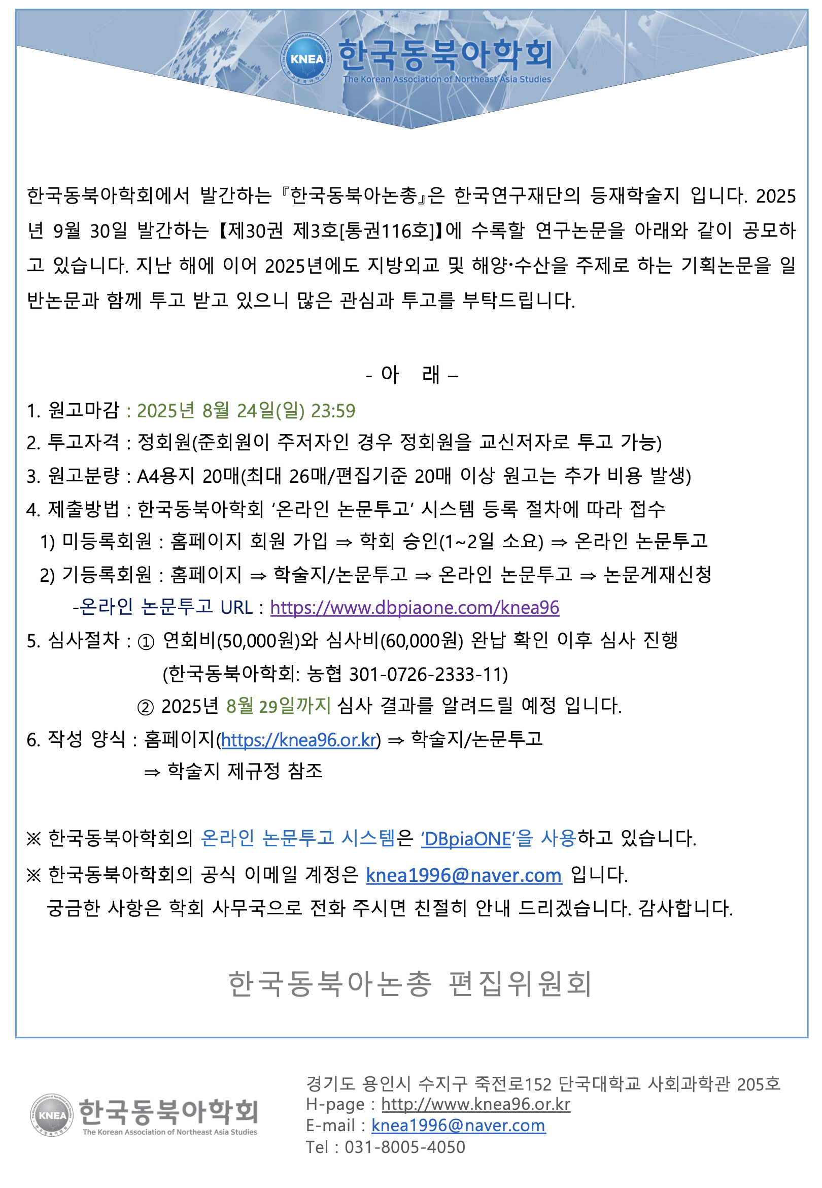 한국동북아학회에서 발간하는 『한국동북아논총』은 한국연구재단의 등재학술지 입니다. 2025 년 9월 30일 발간하는 【제30권 제3호[통권116호]】에 수록할 연구논문을 아래와 같이 공모하 고 있습니다. 지난 해에 이어 2025년에도 지방외교 및 해양, 수산을 주제로 하는 기획논문을 일반논문과 함께 투고 받고 있으니 많은 관심과 투고를 부탁드립니다.