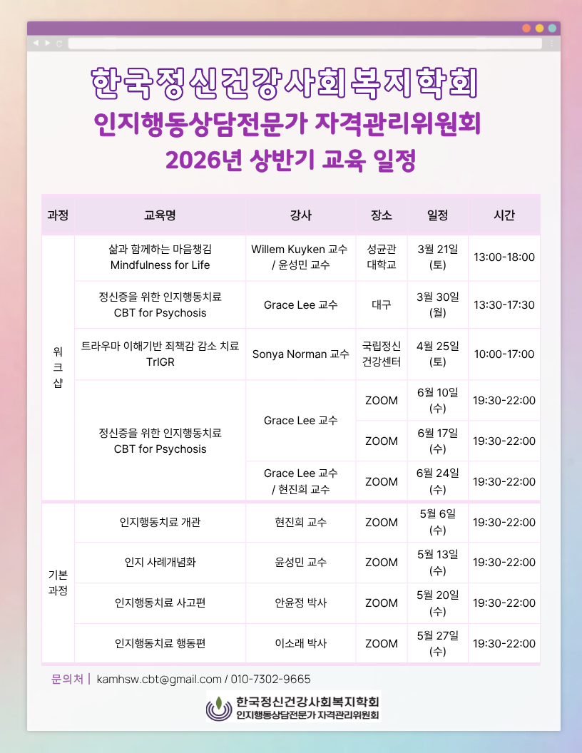 [인지행동상담전문가 자격관리위원회] 2026년 상반기 교육 일정 안내
