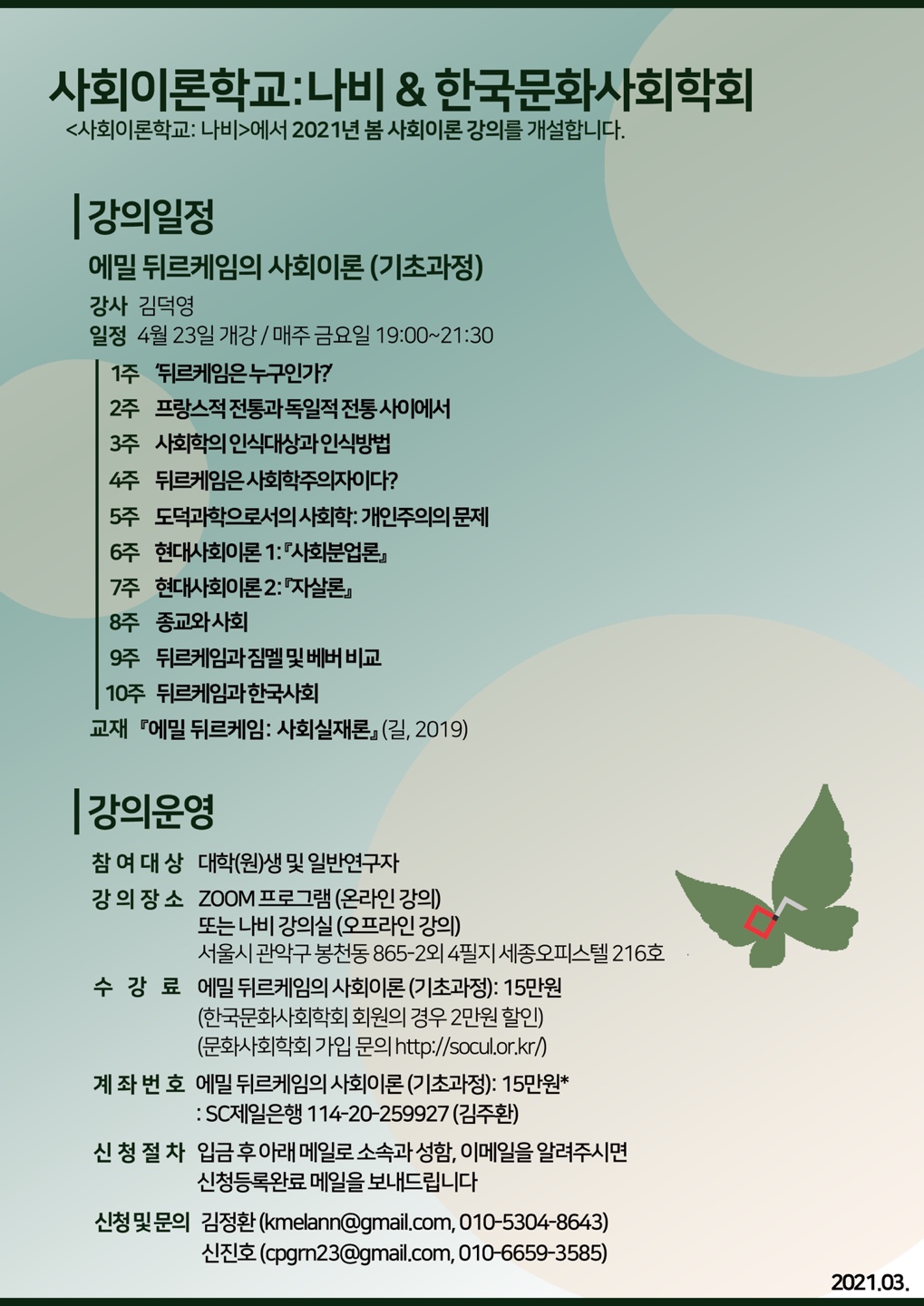 지난 겨울 사회이론 강좌에 이어 올해 봄에도 <한국문화사회학회>와 <사회이론학교:나비>의 공동 기획으로 2021년 봄 사회이론 강좌가 열립니다.