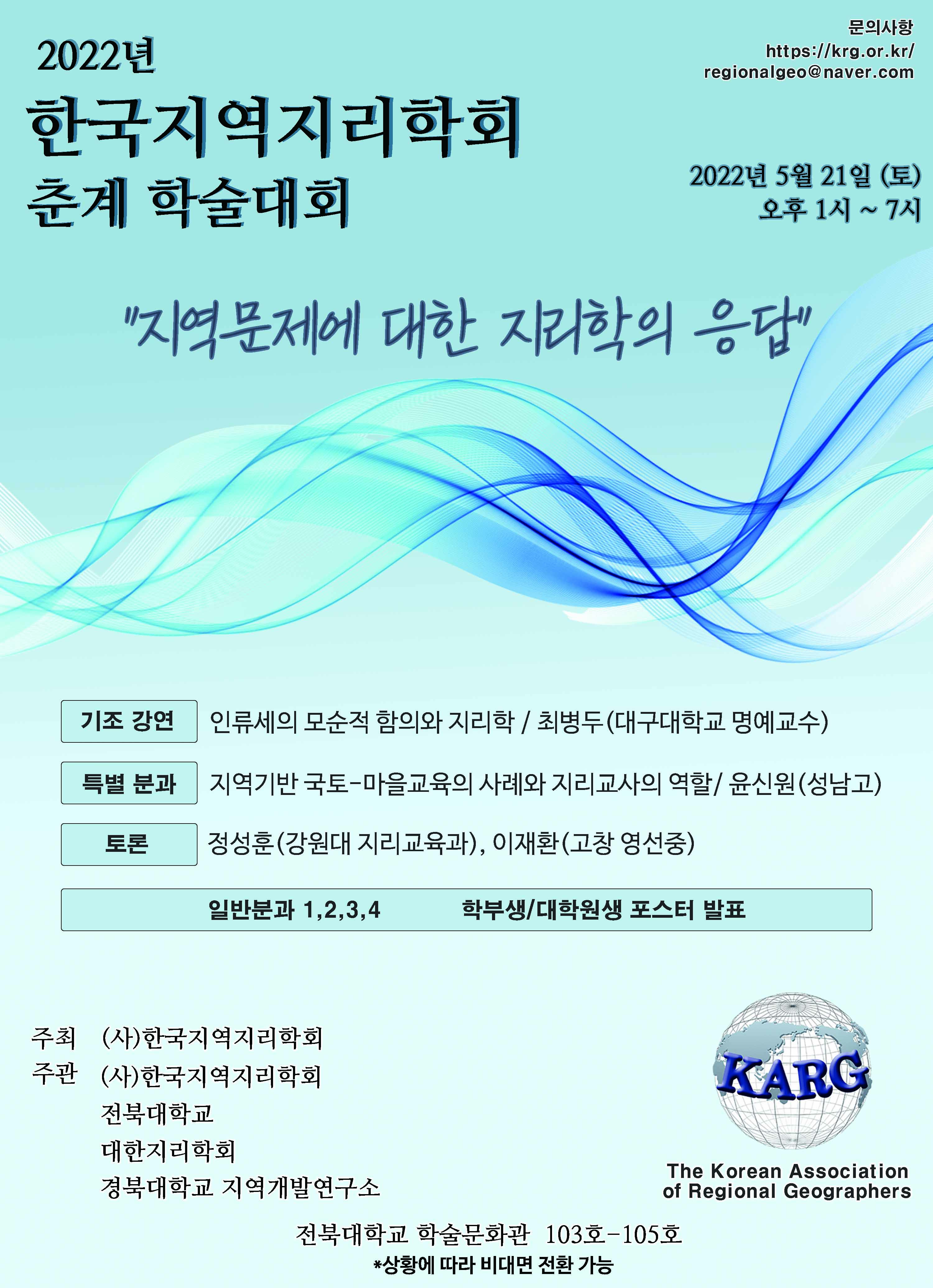이에 한국지역지리학회는 2022년 춘계 정기학술대회를 당초 계획대로 한 달 후인 오는 5월 21()에 전북대학교에서 대면학회로 개최하기로 결정하였습니다.