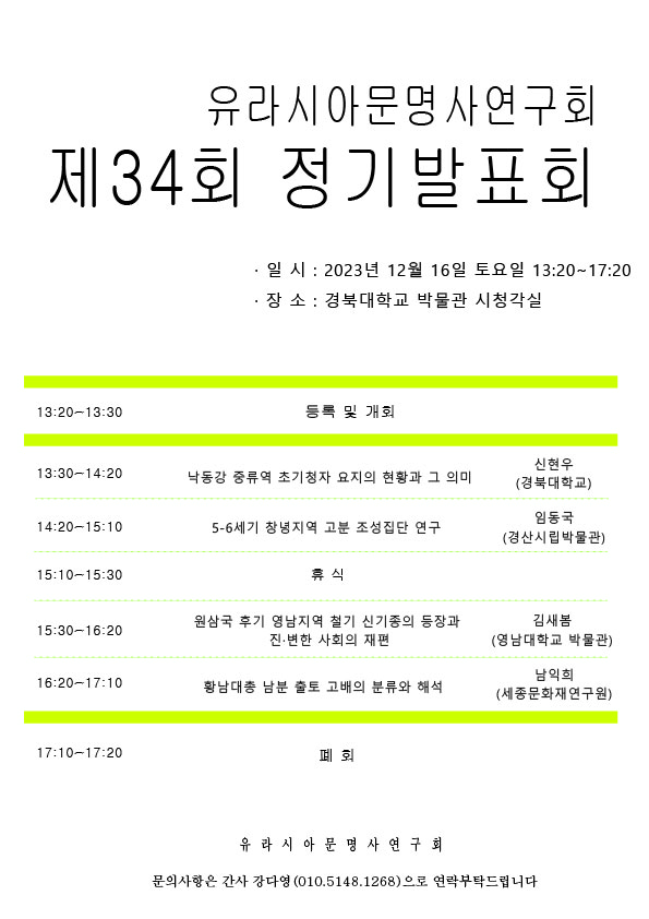 2023년 12월 16일 토요일, 유라시아문명사연구회 제34회 정기발표회가 진행될 예정입니다.