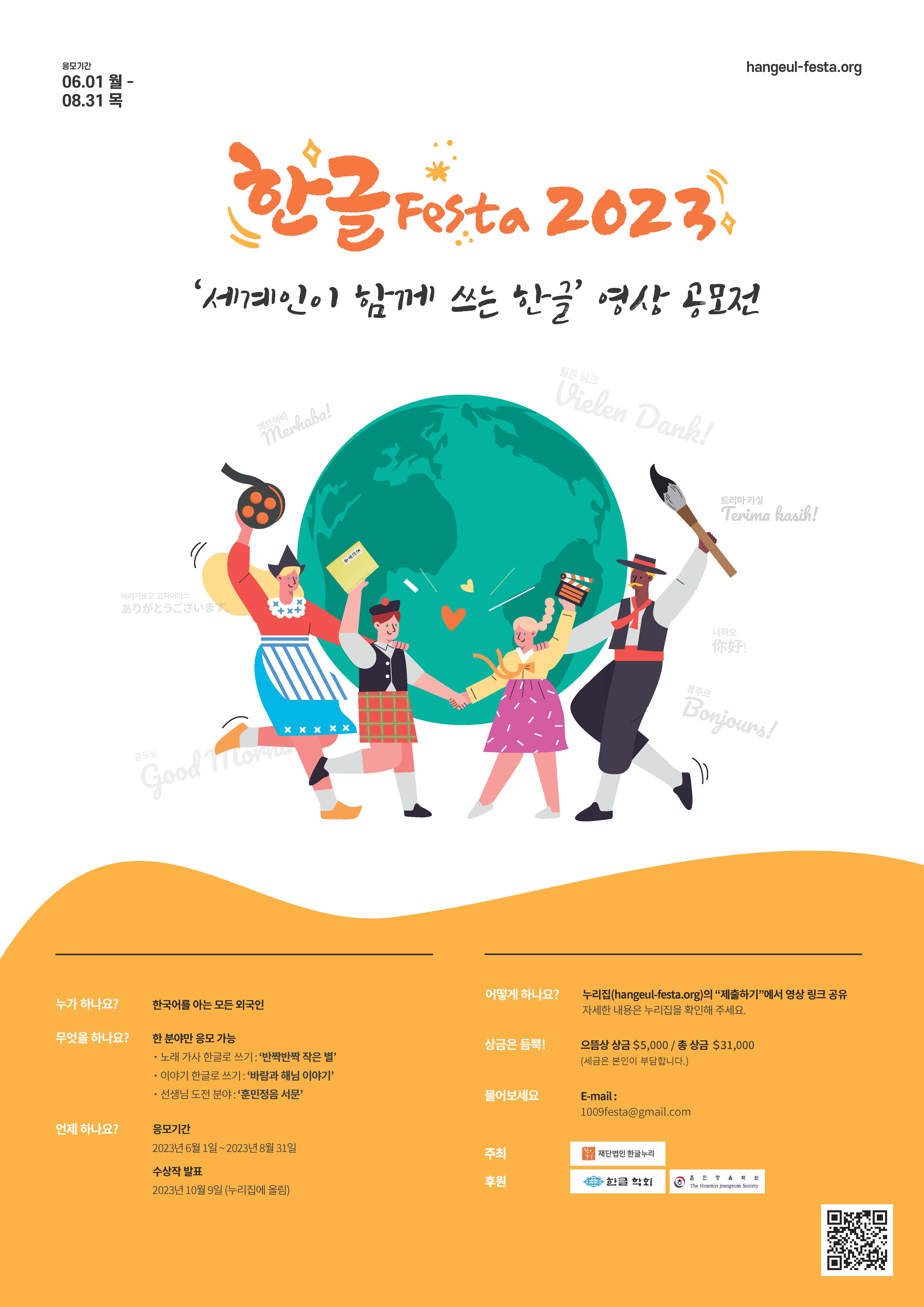 참여를 원하는 외국인은 한글누리 누리집(hangeul-festa.org)에서 공모 및 영상 제작 방법과 관련된 자세한 정보를 얻을 수 있다.영상 제출은 8월 31일까지로, 누리집의 제출하기에 영상 링크를 공유하면 된다. 수상작은 한글날인 10월 9일 홈페이지를 통해 공개되며, 상금 5,000달러가 주어지는 으뜸상을 비롯하여 한글학회 이사장상 등 총 99명에게 31,000달러의 상금이 주어진다.
