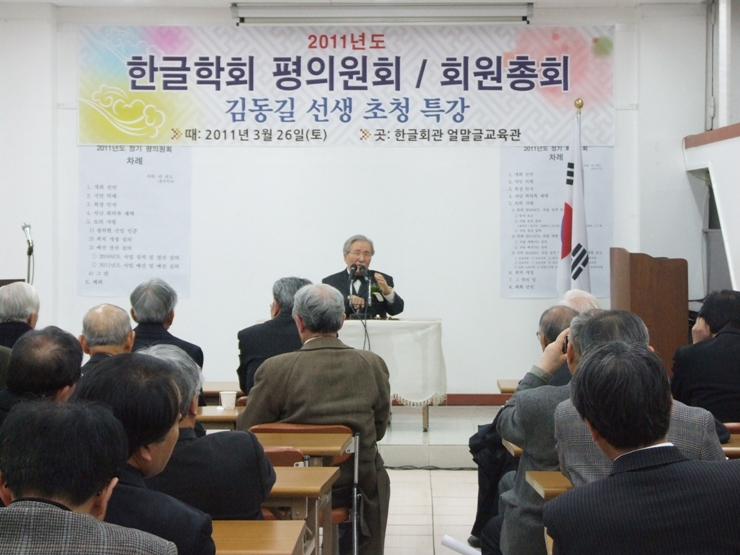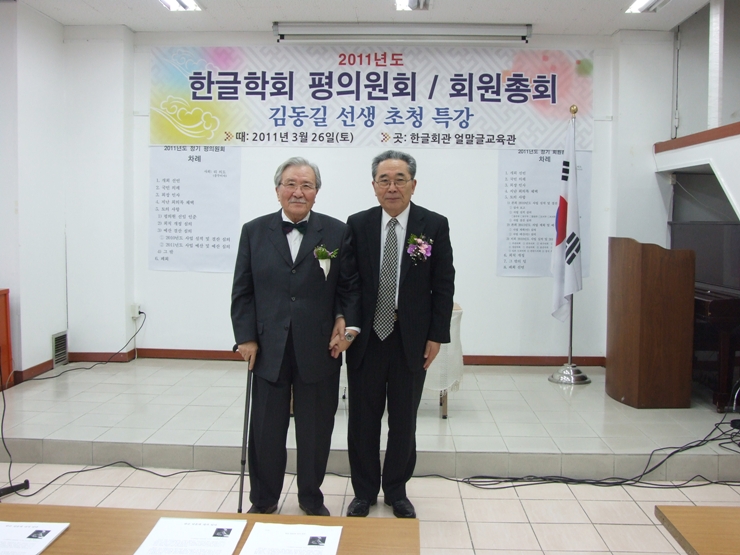 ▲ 2011년도 한글학회 정기 회원총회 기념 김동길 선생 초청 특강을 마치고 자리를 함께한 김동길 선생과 한글학회 김종택 회장(위 사진). 초청 특강을 하고 있는 김동길 선생 모습(아래 사진).