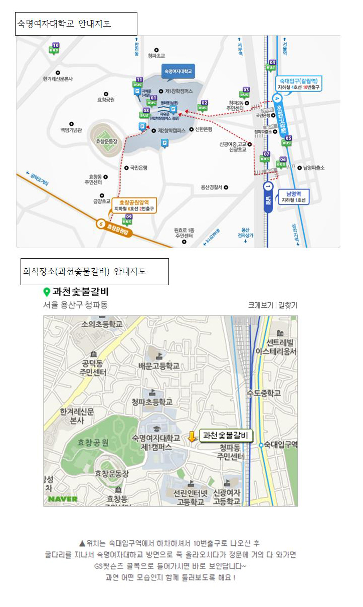10월 10일 월례발표회가 열리는 숙명여대 지도입니다. 이 곳이 익숙한 회원님들도 계시겠지만, 낯설어하는 분들도 있을 것이라 생각합니다. 참고 삼아 지도를 붙입니다.
