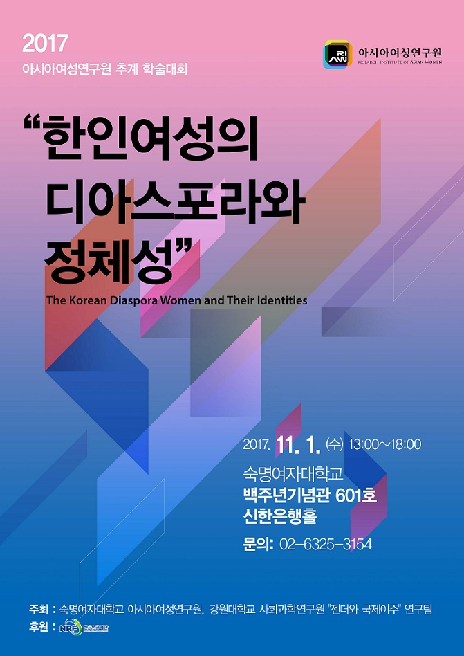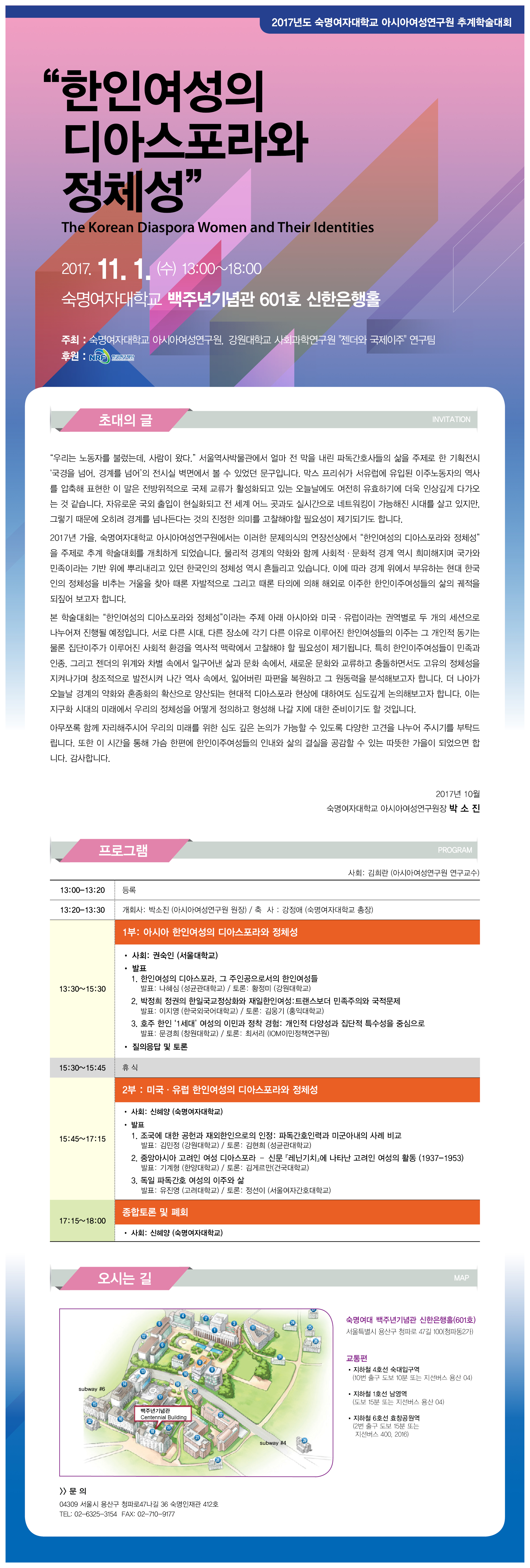 ''한인여성의 디아스포라와 정체성''이라는 주제로 2017년도 추계 학술대회를 개최합니다.