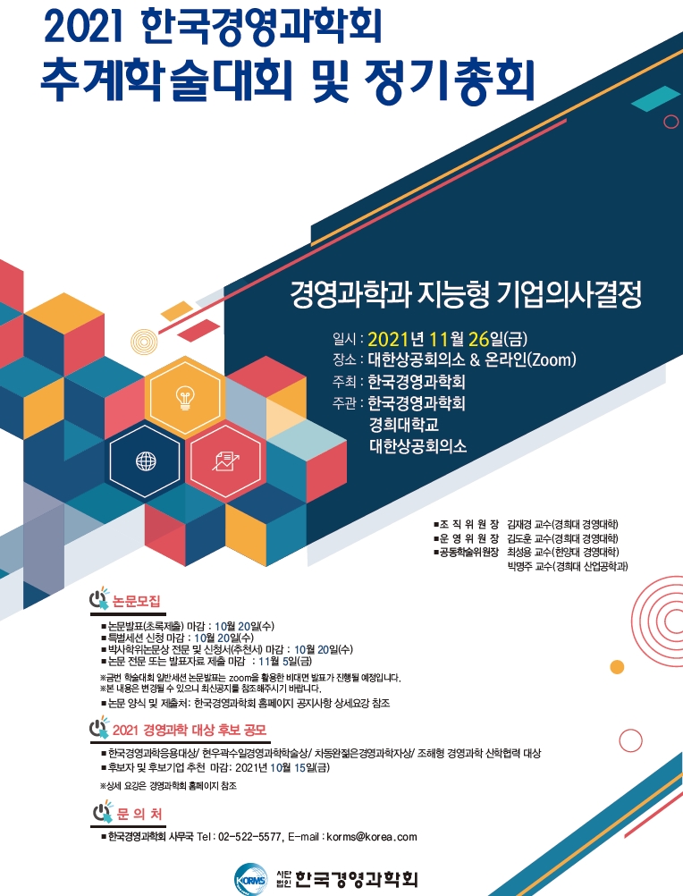 2021년 한국경영과학회 추계학술대회가 대한상공회의소에서 개최됩니다. 이번 추계학술대회는 With Corona 추세를 고려하여 오프라인과 온라인(Zoom) 병행 하이브리드 방식으로 진행될 예정입니다. 이러한 방식을 통하여 시공간의 제약을 최소화함으로써 보다 폭넓은 학술 교류의 장이 될 수 있을 것으로 기대합니다. 최근 경영과학과 지능형 의사결정의 발전은 생활의 변화와 기업비즈니스 모델의 급격한 변화를 촉진하고 있습니다. 또한 빅데이터로 대표되는 데이터의 폭발적인 증가로 인하여 다양한 형태의 빅데이터를 처리하는 딥러닝기법, 자연어처리, 등 다양한 분석기법이 개발되고 있습니다.
