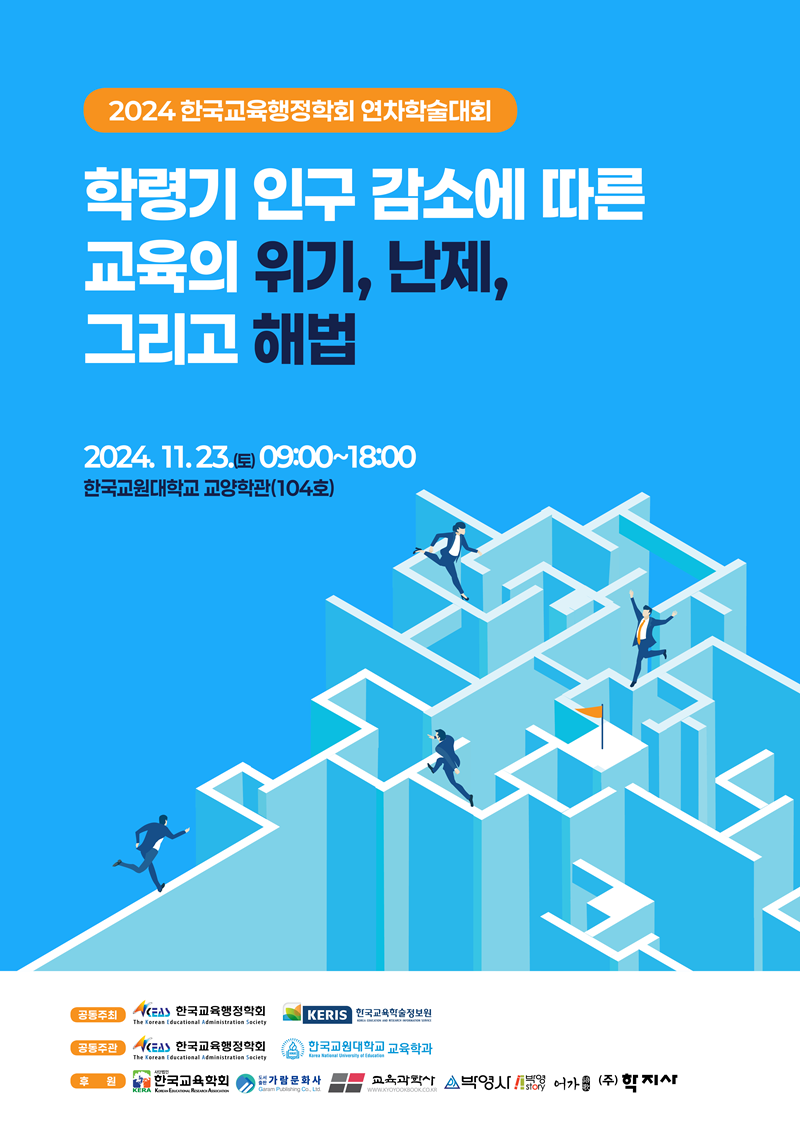 2024년 연차학술대회가 「학령기 인구 감소에 따른 교육의 위기, 난제, 그리고 해법을 주제로 2024년 11월 23일(토)에 개최될 예정입니다.