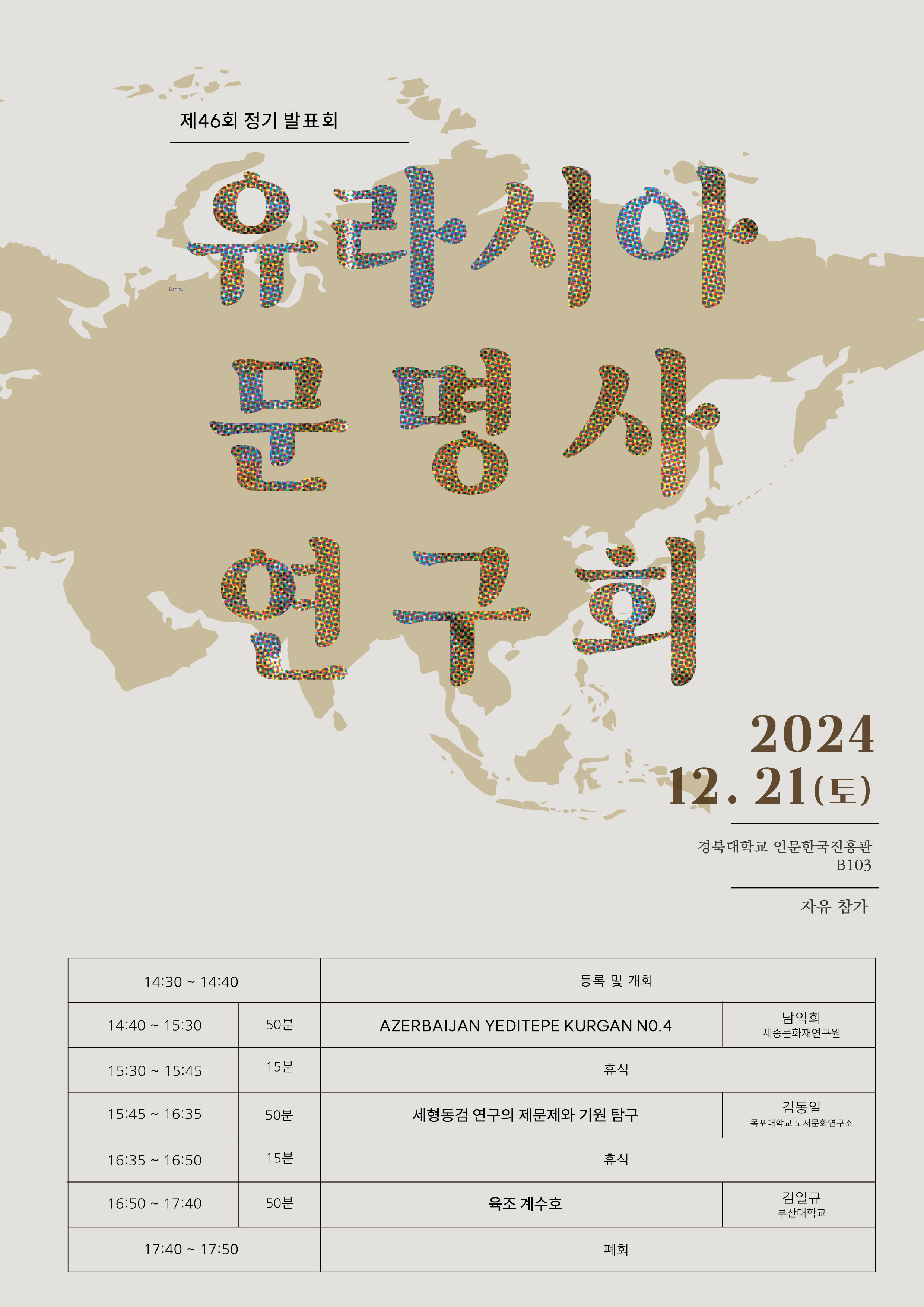 2024년 12월 21일 토요일, 유라시아문명사연구회 제 46회 정기발표회가 진행될 예정입니다.