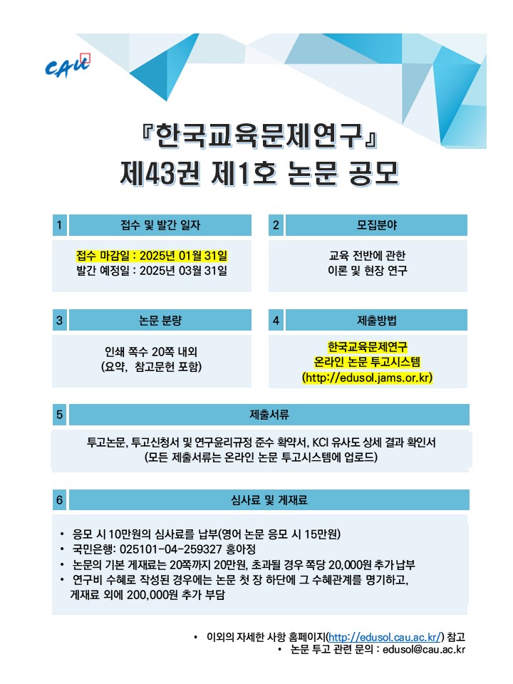중앙대학교 한국교육문제연구소에서 연4회 발간하는『한국교육문제연구』논문집은 KCI 등재지 입니다.