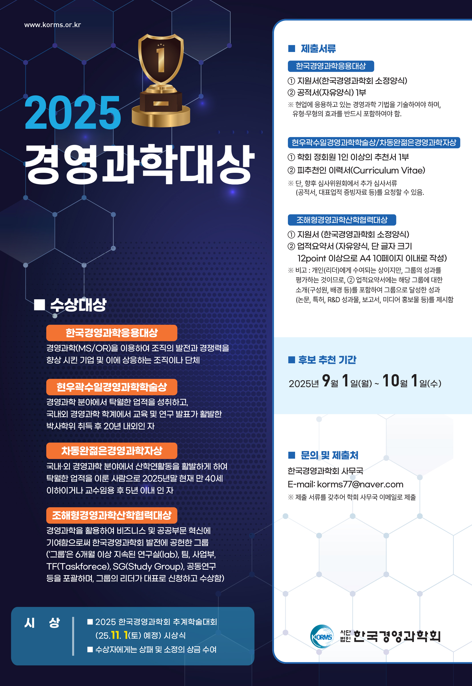 아래와 같이 2025년도 경영과학대상 후보를 공모하오니 주변에 추천해주실 만한 연구자 및 기업이 있으시면 적극적으로 추천하여 주시기 바랍니다.