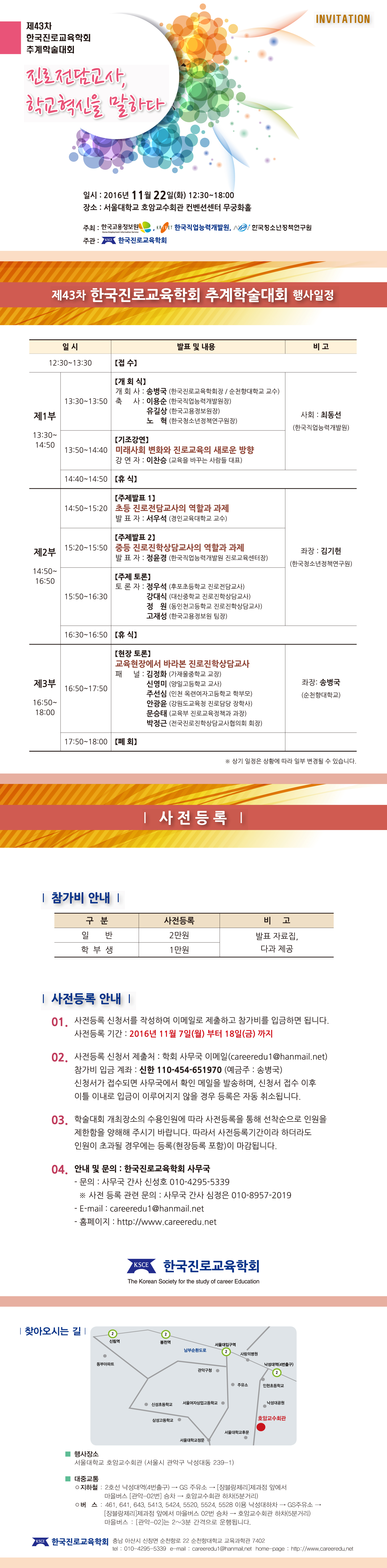 본 학회에서 진로전담교사, 학교혁신을 말하다를 주제로 제 43차 추계학술대회를 개최하게 되었습니다. 회원님들의 많은 관심과 참여를 부탁드립니다.